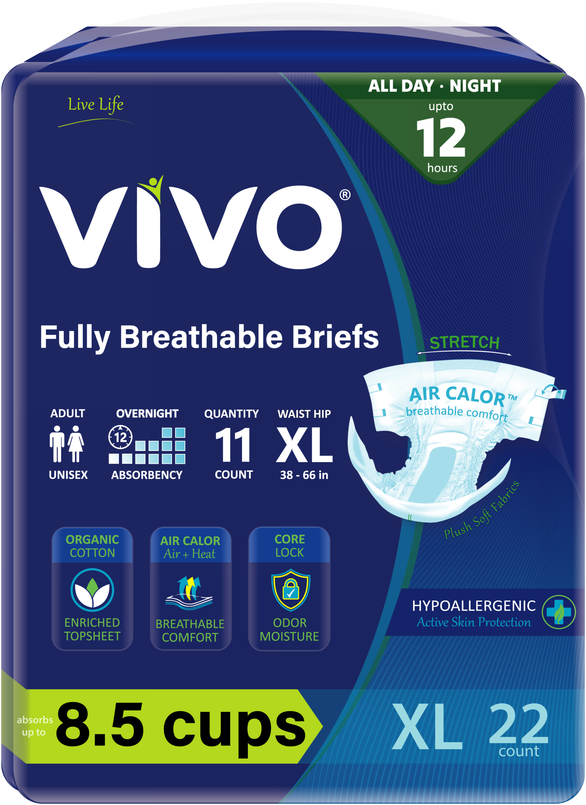 VIVO Adult Diaper Briefs with Tabs, Upto 12hr Absorbency; Organic Cotton Enriched Lining for Sensitive Skin; Air Calor 360 Breathable; Hypoallergenic; FSA/HSA Eligible; Suitable for Extended Day / Night Use; Disposable incontinence briefs for women, men, youth. Dual Wetness Indicators.