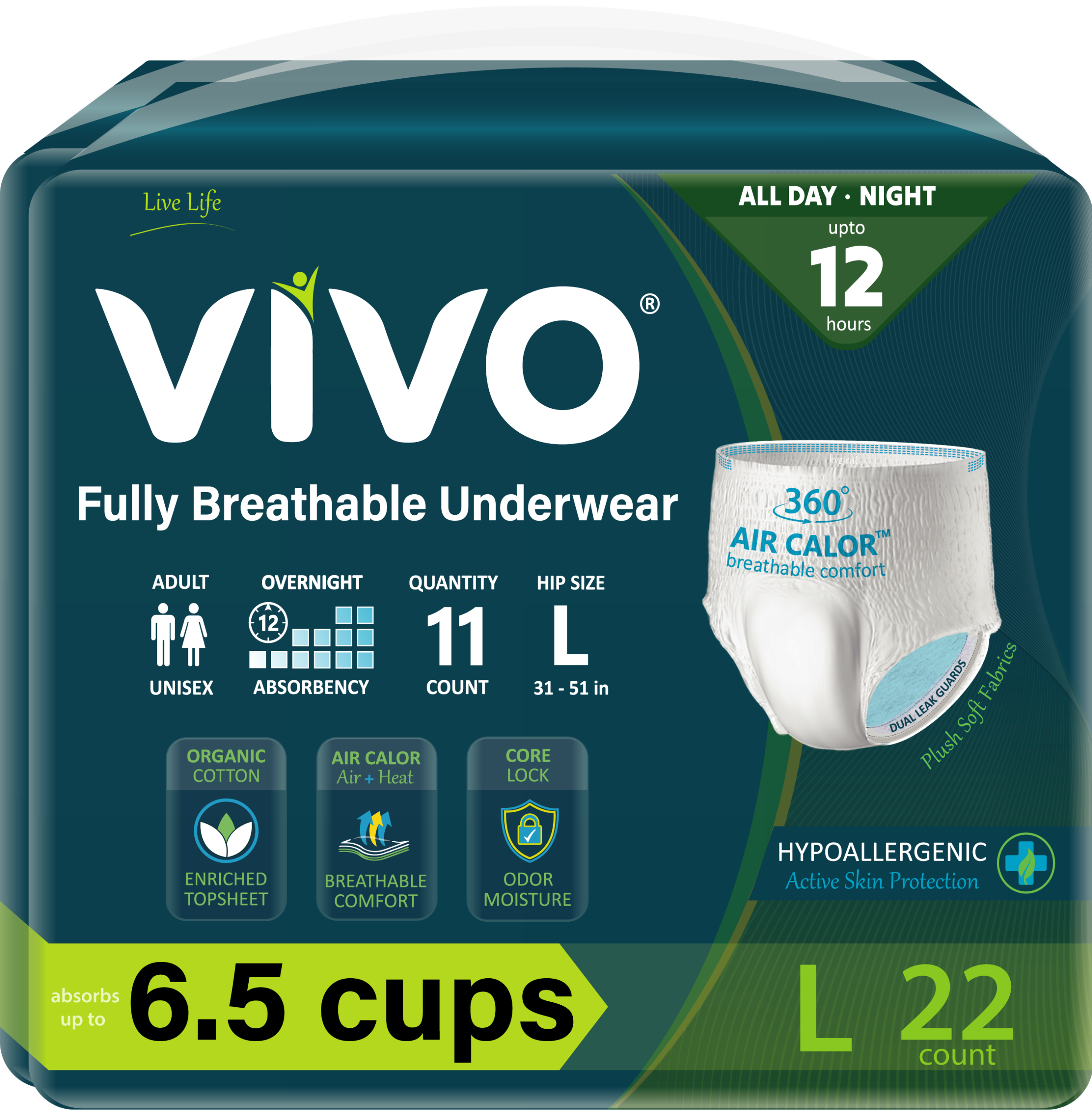 VIVO Breathable Pullups for Women & Men; Up to 12hr Absorbency; Incontinence Protective Underwear, Organic Cotton Enriched Lining for sensitive skin; Air Calor 360; Hypoallergenic; FSA/HSA Eligible; Suitable for Extended Day / Night Use; Dual Wetness Indicators. Rear wrap tab for folded disposal.