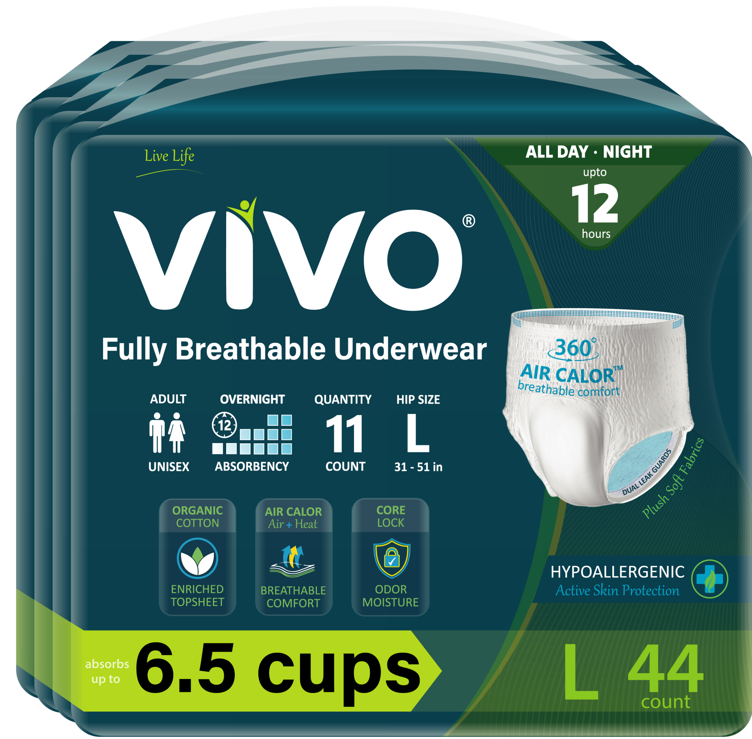 VIVO Breathable Pullups for Women & Men; Up to 12hr Absorbency; Incontinence Protective Underwear, Organic Cotton Enriched Lining for sensitive skin; Air Calor 360; Hypoallergenic; FSA/HSA Eligible; Suitable for Extended Day / Night Use; Dual Wetness Indicators. Rear wrap tab for folded disposal.